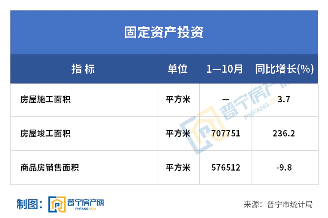 据统计,1-10月普宁商品房销售面积57.65万平方米,下降9.8%。