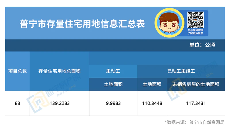 今天,普宁市自然资源局发布了普宁市存量住宅用地情况表,据了解,本次普宁市存量住宅用地项目总数83宗,总面积139.2283公顷(2088.4245亩)。