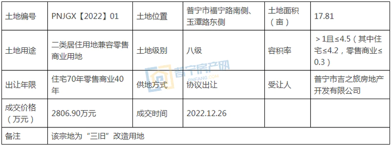根据《中华人民共和国土地管理法》、《协议出让国有土地使用权规范》等有关规定,本着公开、公正、公平的原则,普宁市自然资源局于2022年12月26日以协议方式出让1宗国有土地使用权。现将有关情况公告如下: