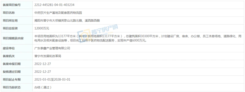 近日,据小房君了解,普宁一批项目启动公示,涉及普宁市民政局普宁市民政福利园建设用地规划许可批前公示、普宁市吉之旅房地产开发有限公司建设用地规划许可批前公示、普宁市自然资源局国有土地使用权协议出让结果公告、广东金泰实业有限公司办公商业综合楼建设工程规划核实批后公示、中药饮片生产基地及配套医药物流园通过备案,具体内容如下: