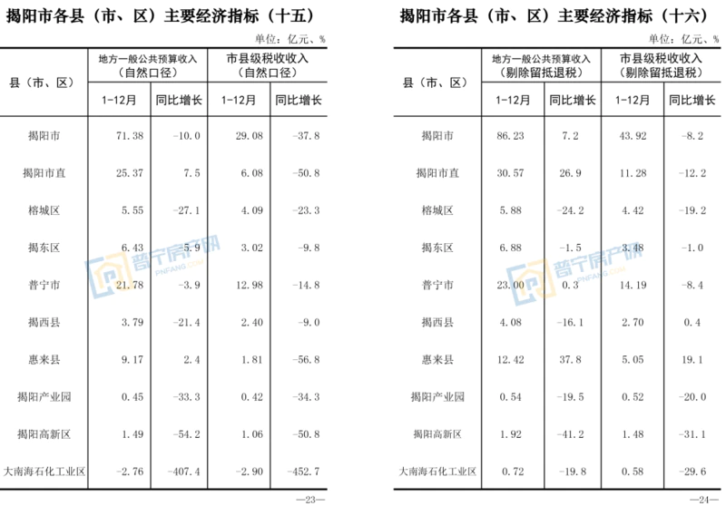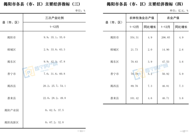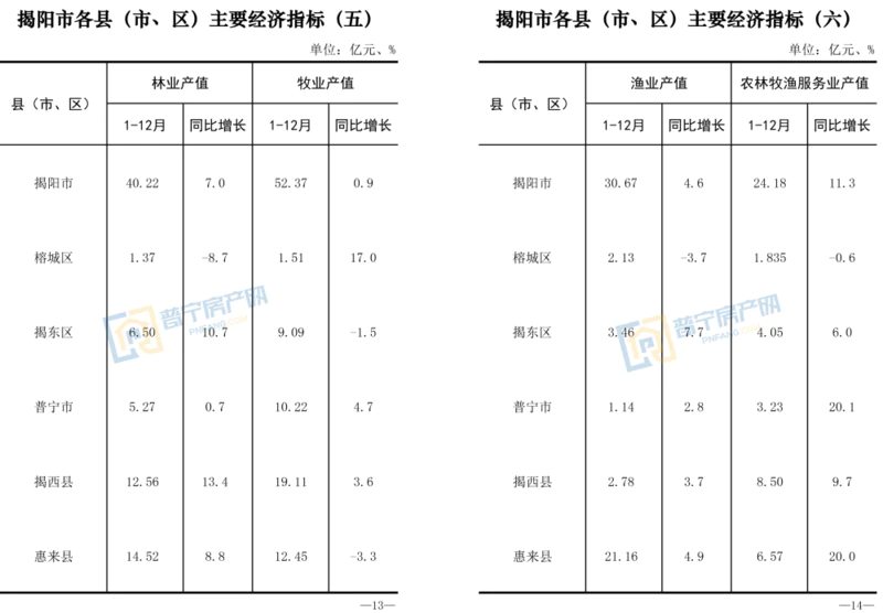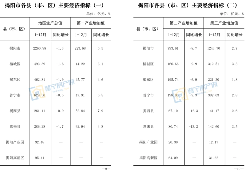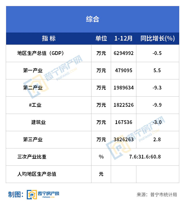 根据揭阳市地区生产总值统一核算结果,2022年我市地区生产总值为629.5亿元,同比下降0.5%。其中,第一产业增加值为47.91亿元,增长5.5%;第二产业增加值为198.96亿元,下降9.3%;第三产业增加值为382.63亿元,增长2.8%。