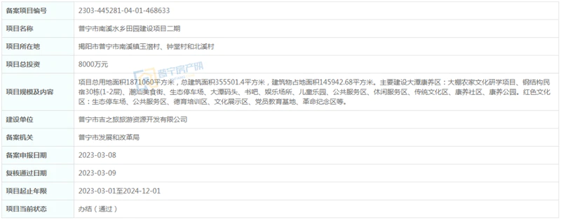 总投资8000万元,位于普宁市南溪镇玉滘村、钟堂村和北溪村,项目总用地面积1871060平方米,总建筑面积355501.4平方米,建筑物占地面积145942.68平方米。主要建设大潭康养区:大棚农家文化研学项目、钢结构民宿30栋(1-2层)、潮汕美食街、生态停车场、大潭码头、书吧、娱乐场所、儿童乐园、公共服务区、休闲服务区、传统文化区、康养社区、康养公园。红色文化区:生态停车场、公共服务区、德育培训区、文化展示区、党员教育基地、革命纪念区等。建设单位为普宁市吉之旅旅游资源开发有限公司,项目起止年限2023-03-01至2024-12-01