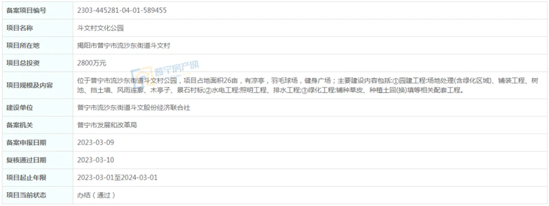 总投资2800万元,位于普宁市流沙东街道斗文村公园,项目占地面积26亩,有凉亭,羽毛球场,健身广场;主要建设内容包括:①园建工程:场地处理(含绿化区域)、铺装工程、树池、挡土墙、风雨连廊、木亭子、景石村标;②水电工程:照明工程、排水工程;③绿化工程:铺种草皮、种植土回(换)填等相关配套工程。建设单位为普宁市流沙东街道斗文股份经济联合社,项目起止年限2023-03-01至2024-03-01
