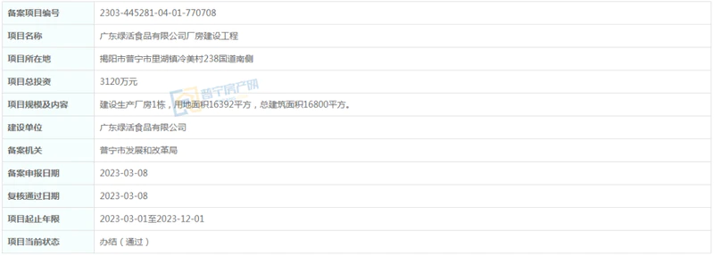 总投资3120万元,位于普宁市里湖镇冷美村238国道南侧,建设生产厂房1栋,用地面积16392平方,总建筑面积16800平方。建设单位为广东绿活食品有限公司,项目起止年限2023-03-01至2023-12-01