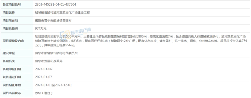 位于普宁市船埔镇告陂村,项目建设用地面积约11500平方米,主要建设内容包括新建告陂村沿河路长约800米,硬底化路面宽7米,包含道路两边人行道铺装及绿化;沿河路及文化广场新建石篱挡土墙长900米,高约5米,配套石栏杆高1米;新建两个文化广场,配套休息座椅、健身器材、统一排水、绿化、公共停车位等。项目总投资估算974万元,其中建安工程费956元。建设单位为普宁市船埔镇告陂村村民委员会,项目起止年限2023-03-01至2023-12-01