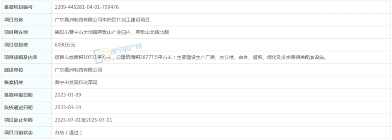 总投资6000万元,位于普宁市大坝镇英歌山产业园内,英歌山北路北侧,项目占地面积10711平方米,总建筑面积26777.5平方米:主要建设生产厂房、办公楼、宿舍、道路、绿化及排水等相关配套设施。建设单位为广东嘉洲制药有限公司,项目起止年限2023-07-01至2025-07-01