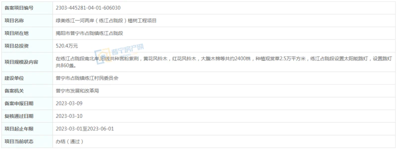 总投资520.4万元,位于普宁市占陇镇练江占陇段,在练江占陇段南北岸,沿线共种宫粉紫荆,黄花风铃木,红花风铃木,大腹木棉等共约2400株,种植观赏草2.5万平方米,练江占陇段设置太阳能路灯,设置路灯共860盏。建设单位为普宁市占陇镇练江村民委员会,项目起止年限2023-03-01至2023-06-01