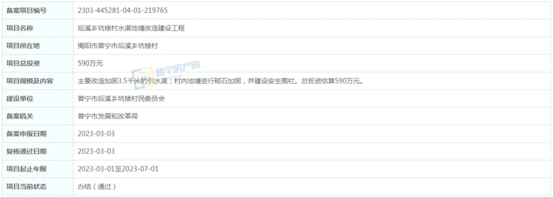 位于普宁市后溪乡坑楼村,主要改造加固3.5千米的引水渠;村内池塘进行砌石加固,并建设安全围栏。总投资估算590万元。建设单位为普宁市后溪乡坑楼村民委员会,项目起止年限2023-03-01至2023-07-01
