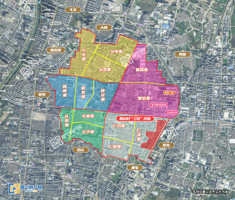 新坛村“三旧”改造范围包括信发里,信安里,信德里,礼荣里,礼章里、礼华里,义孝 礼,义文里,义忠里,智昌里,智贤里,总面积1800745平方米。可用于三旧改造面积约918774平方米(1993年村集体规划分给村民建成的民楼除外),项目计划分为两期开发。