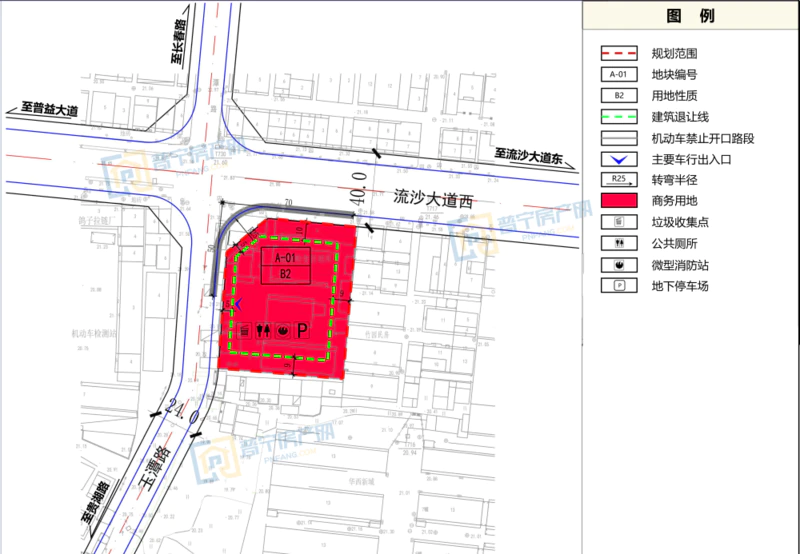 4、交通组织:规划区主要对外道路为流沙大道西和玉潭路,道路宽度分别为40米和24米。