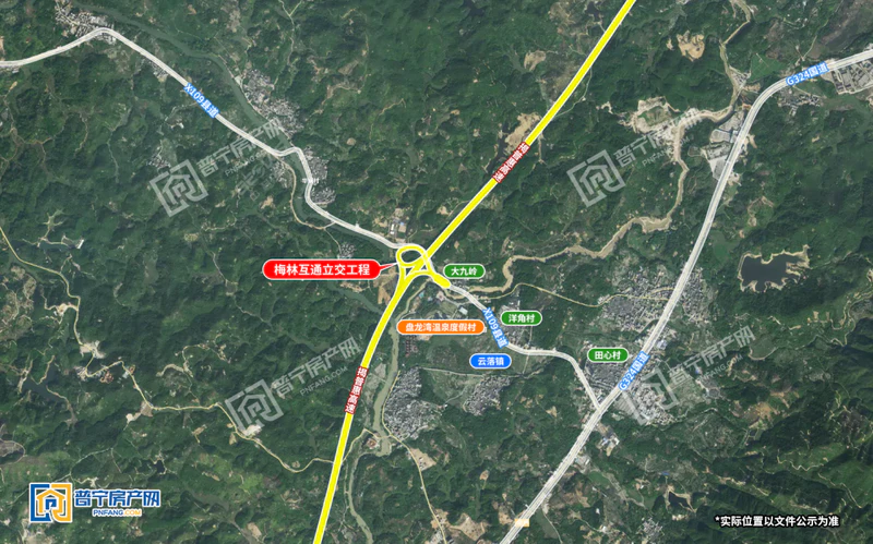 普惠高速公路梅林互通立交工程位于普宁市云落镇与梅林镇交界处的洋角村大九岭,互通立交出口接县道X109,进而连接国道G234。