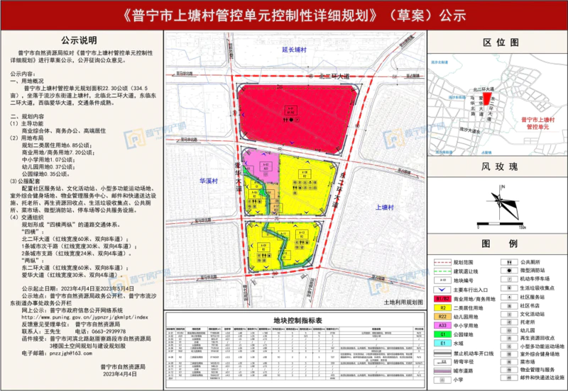 普宁市自然资源局拟对《普宁市上塘村管控单元控制性详细规划》进行草案公示,公开征询公众意见。