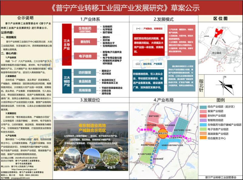 近日,普宁产业转移工业园管委会对《普宁产业转移工业园控制性详细规划修编》《普宁产业转移工业园产业发展研究》进行草案公示,公开征询公众意见。据了解,普宁产业转移工业园规划区域总面积为16290亩,总体打造“粤东制造业高地,产城融合示范区”,以生物医药(含医疗器械)、新材料、电子信息为主导产业,以纺织服装、食品制造、高端装备为辅助产业,引领高端生产要素集聚,打造宜居宜业的智创科技生态园区。