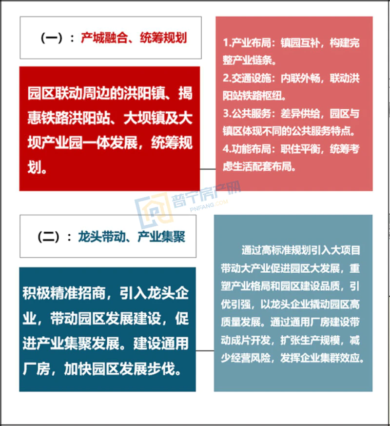产城融合、统筹规划:园区联动周边的洪阳镇、揭惠铁路洪阳站、大坝镇及大坝产业园一体发展,统筹规划。