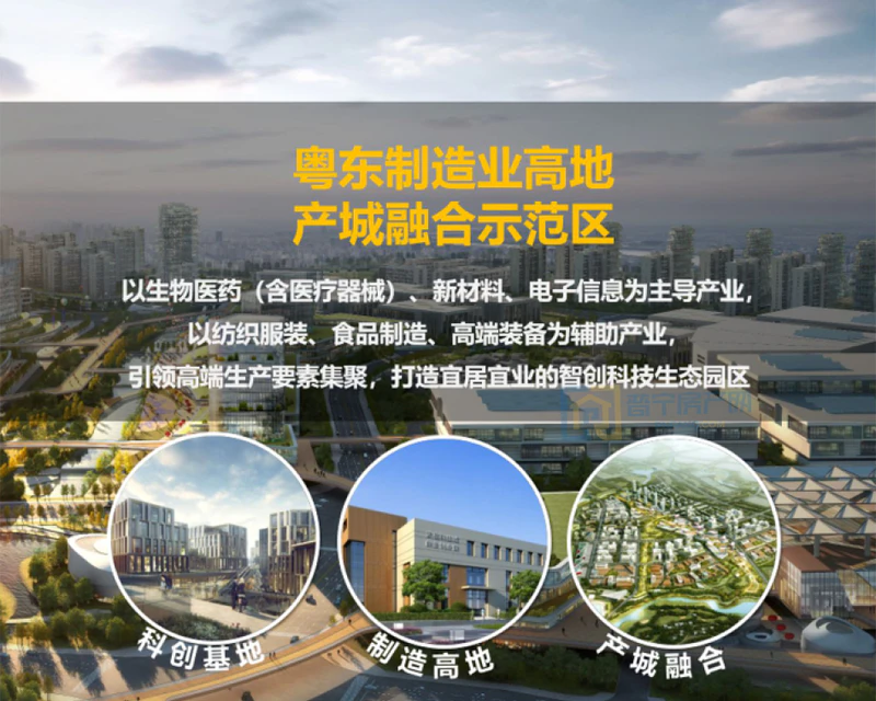 总体打造“粤东制造业高地,产城融合示范区”,以生物医药(含医疗器械)、新材料、电子信息为主导产业,纺织服装、食品制造、高端装备为辅助产业,引领高端生产要素集聚,打造宜居宜业的智创科技生态园区。