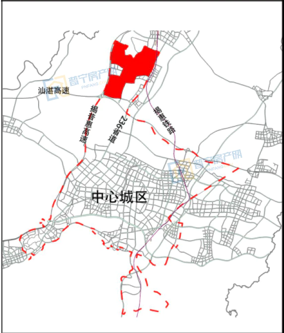 规划区地处于普宁市中心城区北部,汕湛高速以北,S236以西,揭普惠高速以东,距离普宁市区约7公里。规划区域总面积为10.86平方千米。