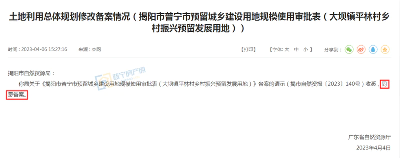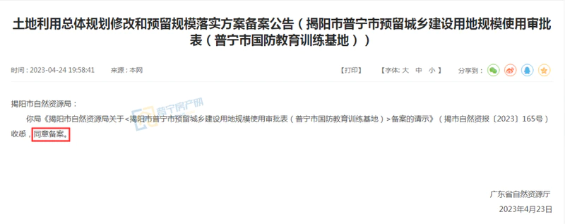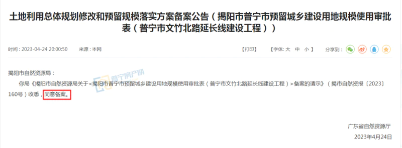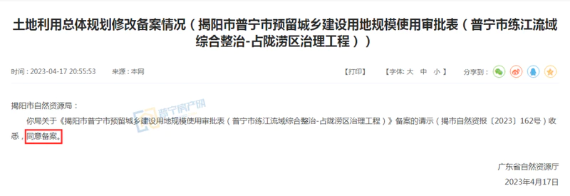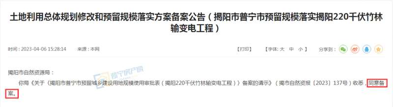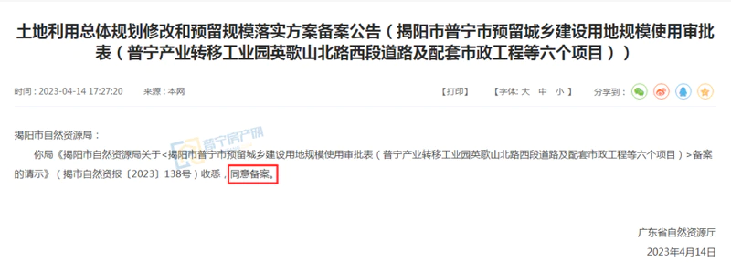 近日,据小房君了解, 普宁市一批预留城乡建设用地规模使用审批表获广东省自然资源厅同意备案,涉及普宁市文竹北路延长线建设工程、普宁市国防教育训练基地、普宁市纺织印染环保综合处理中心公共服务片区、普宁市大南山(楼盘详情户型图相册地图)街道新建液化气供应站及配套设施项目、南径镇四睦村乡村振兴预留发展用地、枧头寮村地块管控单元、大坝镇平林村公益性生态公墓、普宁市军埠镇液化石油气储配站及配套设施项目、普宁市练江流域综合整治-占陇涝区治理工程、普宁产业转移工业园英歌山北路西段道路及配套市政工程等六个项目、揭阳220千伏竹林输变电工程、大坝镇平林村乡村振兴预留发展用地、洪阳镇宝镜院村宅基地项目、广东能源大池农场光伏复合项目升压站共12个项目,合计54.9078公顷(823.617亩),具体内容如下: