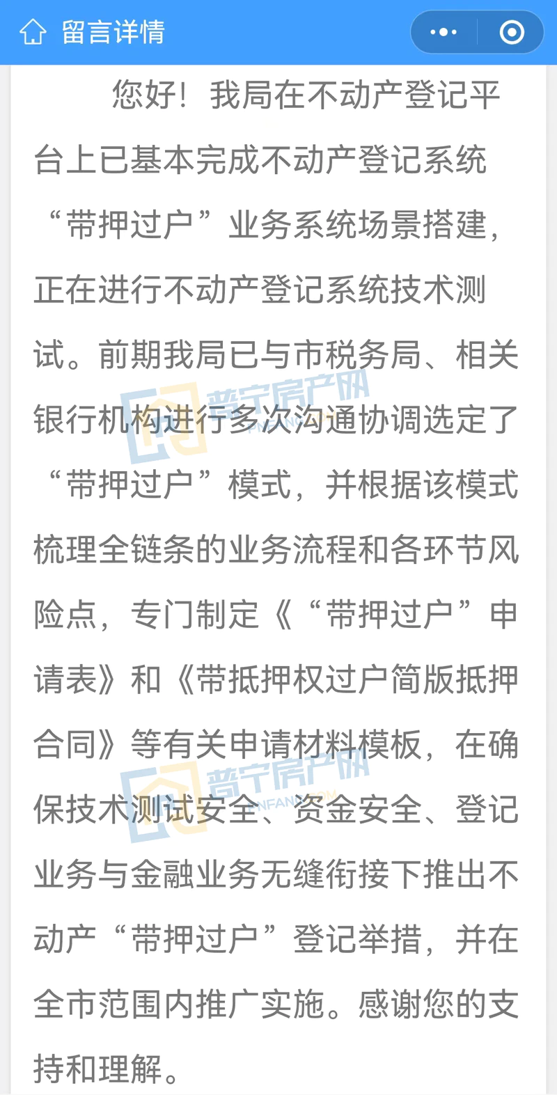 近日,有网友在揭阳“急难愁盼我来办”平台咨询关于不动产带押过户的问题,询问揭阳可有具体方案,对此揭阳市自然资源局回复:在不动产登记平台上已基本完成不动产登记系统“带押过户”业务系统场景搭建,正在进行不动产登记系统技术测试。具体内容如下: