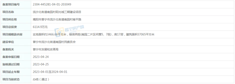 位于普宁市流沙北街道南园村南平路,总投资6114.9万元,实地面积约3466.66平方米,楼房两栋(南园二片区何厝5、7栋),高17层,建筑面积37065平方米。建设单位为普宁市流沙北街道南园村民委员会,项目起止年限2023-04-01至2024-04-01