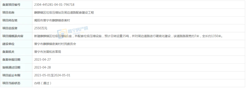 位于普宁市麒麟镇奇美村,总投资2550万元,新建麒麟镇区垃圾压缩站1座,并配套垃圾压缩设施,预计日转运量35吨,并对周边道路进行硬底化建设,该道路路面宽约7米,全长约1350米。建设单位为普宁市麒麟镇奇美村村民委员会,项目起止年限2023-05-01至2024-05-01