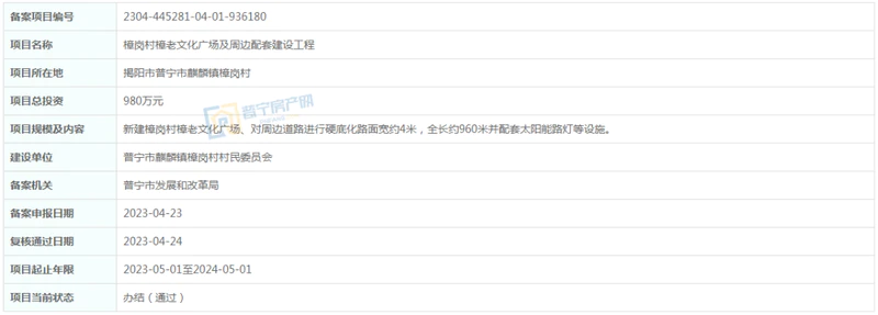 位于普宁市麒麟镇樟岗村,总投资980万元,新建樟岗村樟老文化广场、对周边道路进行硬底化路面宽约4米,全长约960米并配套太阳能路灯等设施。建设单位为普宁市麒麟镇樟岗村村民委员会,项目起止年限2023-05-01至2024-05-01