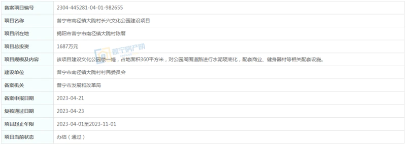 位于普宁市南径镇大陇村陈厝,总投资1687万元,该项目建设文化公园楼一幢,占地面积360平方米,对公园周围道路进行水泥硬底化,配套商业、健身器材等相关配套设施。建设单位为普宁市南径镇大陇村村民委员会,项目起止年限2023-04-01至2023-11-01