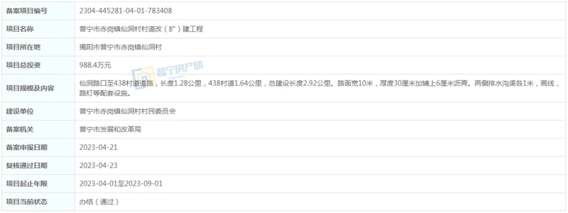 位于普宁市赤岗镇仙洞村,总投资988.4万元,仙洞路口至438村道道路,长度1.28公里,438村道1.64公里,总建设长度2.92公里。路面宽10米,厚度30厘米加铺上6厘米沥青。两侧排水沟渠各1米,画线,路灯等配套设施。建设单位为普宁市赤岗镇仙洞村村民委员会,项目起止年限2023-04-01至2023-09-01