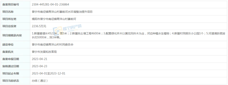 位于普宁市南径镇青洋山村寨前河,总投资2236.5万元,建设内容1.新建碧道长4522米,宽5米;2.新建挡土墙工程4600米;3.配置绿化乔木以黄花凤铃木为主,河边种植水生植物;4.新建村民娱乐小公园1个;5.河道清淤疏浚长约5000米,深3米等。建设单位为普宁市南径镇青洋山村村民委员会,项目起止年限2023-04-01至2023-12-01