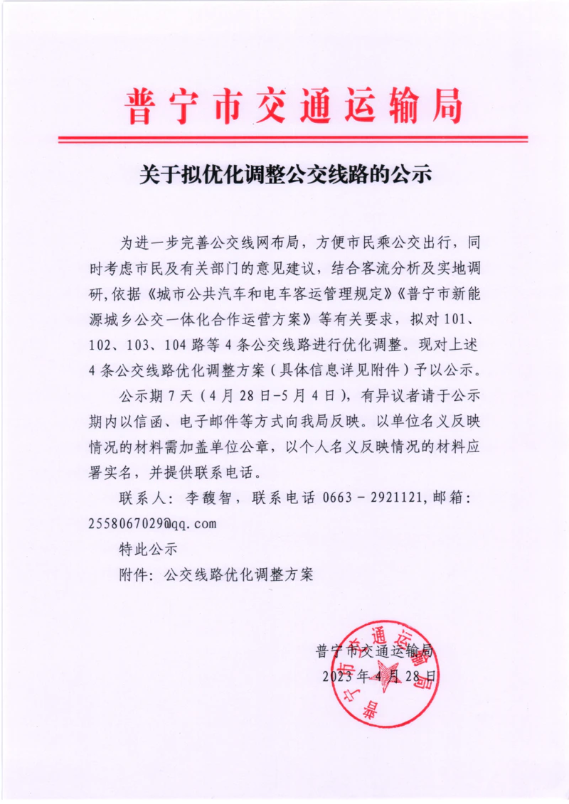为进一步完善公交线网布局,方便市民乘公交出行,同时考虑市民及有关部门的意见建议,结合客流分析及实地调研,依据《城市公共汽车和电车客运管理规定》《普宁市新能源城乡公交一体化合作运营方案》等有关要求,拟对101、102、103、104路等4条公交线路进行优化调整。现对上述4条公交线路优化调整方案(具体信息详见附件)予以公示。