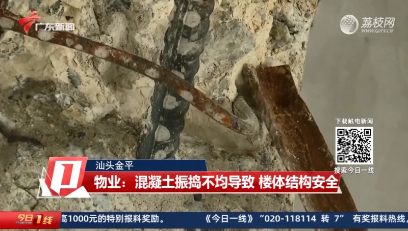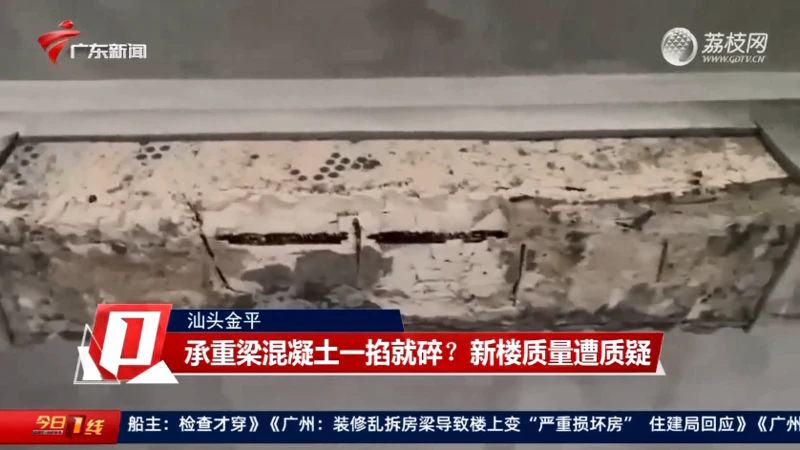 近日,据今日一线报道,汕头金平区街坊阿梅报料,她购买的新房4月份收楼时发现承重梁有鼓包的现象,于是她检查了一下,没想到这一检查发现梁上的混凝土犹如泥巴一般,一捏就碎。这让她十分担忧,承重梁的质量可是关系着整栋楼的安全。具体什么情况呢?