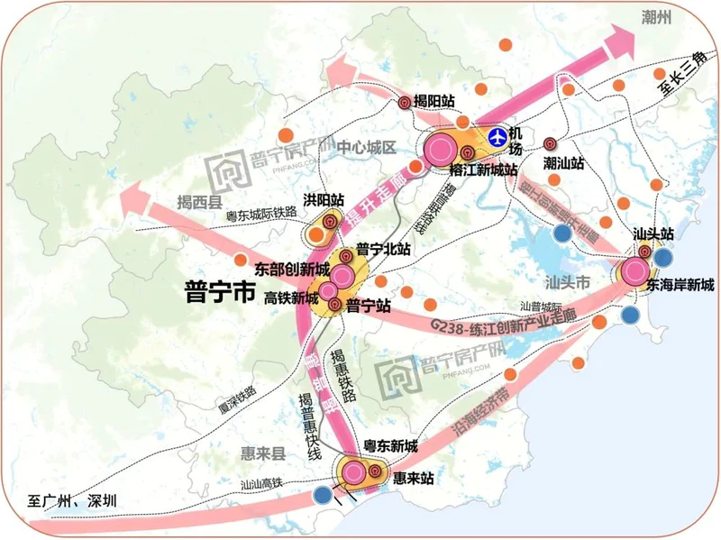 依托厦深铁路、揭惠铁路两大铁路线,打造普宁站、普宁北站及洪阳站三大铁路客运枢纽,加快建设普宁客运站公路客运枢纽。