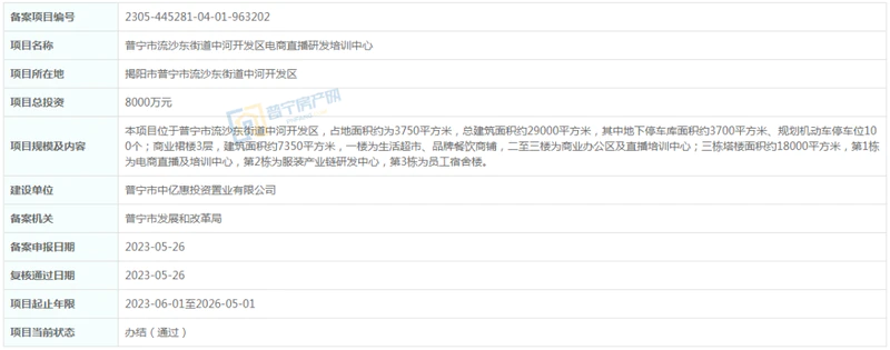 总投资8000万元,本项目位于普宁市流沙东街道中河开发区,占地面积约为3750平方米,总建筑面积约29000平方米,其中地下停车库面积约3700平方米、规划机动车停车位100个;商业裙楼3层,建筑面积约7350平方米,一楼为生活超市、品牌餐饮商铺,二至三楼为商业办公区及直播培训中心;三栋塔楼面积约18000平方米,第1栋为电商直播及培训中心,第2栋为服装产业链研发中心,第3栋为员工宿舍楼。建设单位为普宁市中亿惠投资置业有限公司,项目起止年限2023-06-01至2026-05-01
