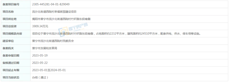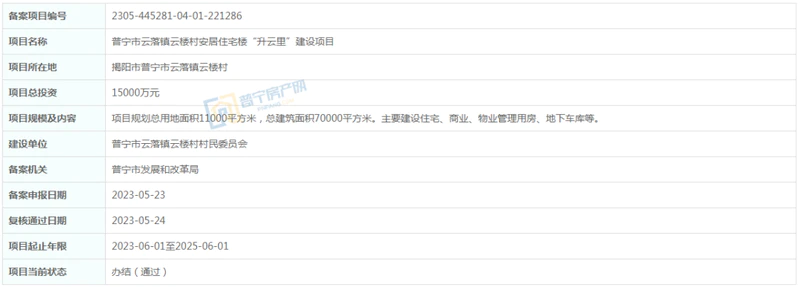 位于普宁市云落镇云楼村,总投资15000万元,项目规划总用地面积11000平方米,总建筑面积70000平方米。主要建设住宅、商业、物业管理用房、地下车库等。建设单位为普宁市云落镇云楼村村民委员会,项目起止年限2023-06-01至2025-06-01