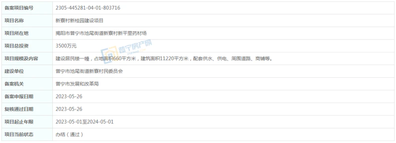 位于普宁市池尾(楼盘详情户型图相册地图)街道新寮村新平里药材场,总投资3500万元,建设居民楼一幢,占地面积660平方米,建筑面积11220平方米,配套供水、供电、周围道路、商铺等。建设单位为普宁市池尾街道新寮村民委员会,项目起止年限2023-05-01至2024-05-01