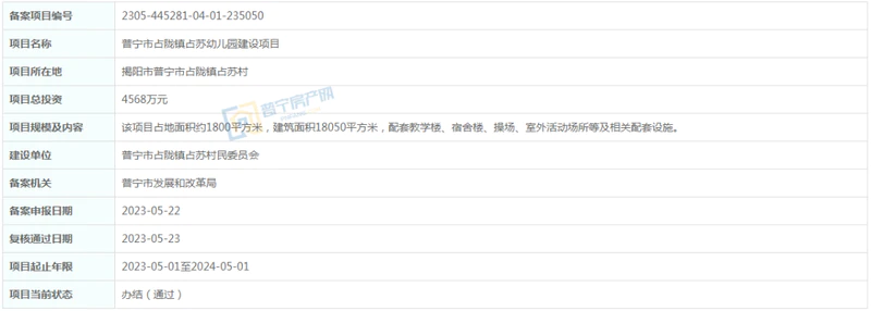 位于普宁市占陇镇占苏村,总投资4568万元,该项目占地面积约1800平方米,建筑面积18050平方米,配套教学楼、宿舍楼、操场、室外活动场所等及相关配套设施。建设单位为普宁市占陇镇占苏村民委员会,项目起止年限2023-05-01至2024-05-01