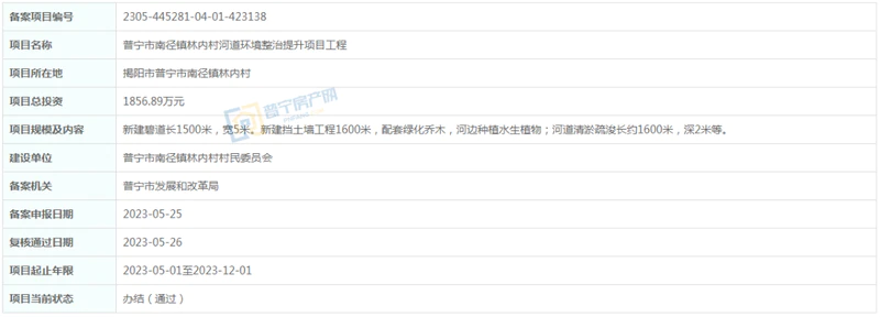 位于普宁市南径镇林内村,总投资1856.89万元,新建碧道长1500米,宽5米。新建挡土墙工程1600米,配套绿化乔木,河边种植水生植物;河道清淤疏浚长约1600米,深2米等。建设单位为普宁市南径镇林内村村民委员会,项目起止年限2023-05-01至2023-12-01