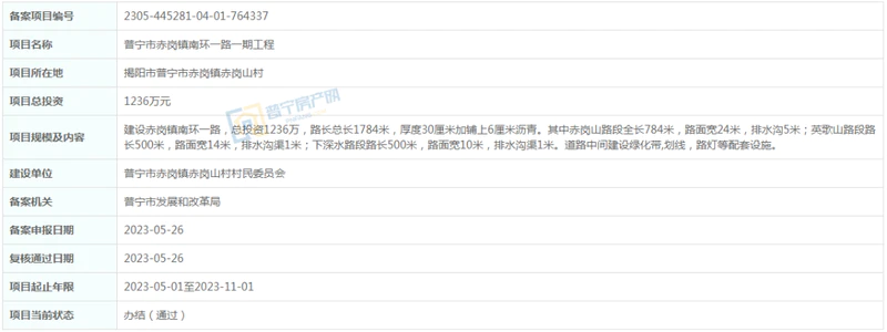 位于普宁市赤岗镇赤岗山村,总投资1236万元,建设赤岗镇南环一路,总投资1236万,路长总长1784米,厚度30厘米加铺上6厘米沥青。其中赤岗山路段全长784米,路面宽24米,排水沟5米;英歌山路段路长500米,路面宽14米,排水沟渠1米;下深水路段路长500米,路面宽10米,排水沟渠1米。道路中间建设绿化带,划线,路灯等配套设施。建设单位为普宁市赤岗镇赤岗山村村民委员会,项目起止年限2023-05-01至2023-11-01