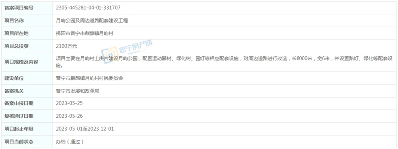 位于普宁市麒麟镇月屿村,总投资2100万元,项目主要在月屿村上庚片建设月屿公园,配置运动器材、绿化树、园灯等相应配套设施,对周边道路进行改造,长8000米,宽6米,并设置路灯、绿化等配套设施。建设单位为普宁市麒麟镇月屿村村民委员会,项目起止年限2023-05-01至2023-12-01