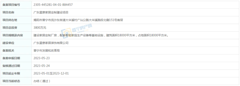 位于普宁市流沙东街道大华溪村广汕公路大华溪路段北侧151号首层,总投资3800万元,建设家居定制厂房,配套智能家庭生产设备等基础设施,建筑面积18000平方米,占地面积18000平方米。建设单位为广东星意家居装饰有限公司,项目起止年限2023-05-01至2023-12-01