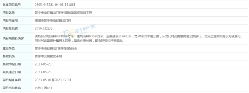 位于普宁市南径镇龙门村,总投资2056.32万元,该项目占地面积48000平方米,建筑面积800平方米。主要建设长2400米,宽20米双车道公路,从龙门村到揭惠高速公路接口。对周边道路实施水泥硬底化,同时对该路段种植树木花草,路边休息长椅,配套照明栏杆等设施。建设单位为普宁市南径镇龙门村村民委员会,项目起止年限2023-05-01至2023-12-01