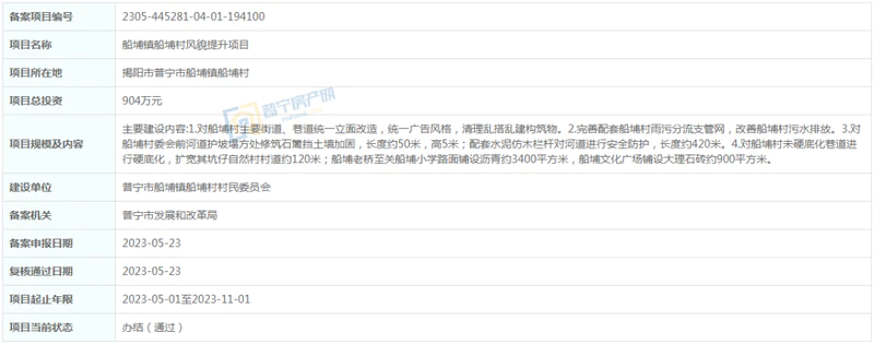 位于普宁市船埔镇船埔村,总投资904万元,主要建设内容:1.对船埔村主要街道、巷道统一立面改造,统一广告风格,清理乱搭乱建构筑物。2.完善配套船埔村雨污分流支管网,改善船埔村污水排放。3.对船埔村委会前河道护坡塌方处修筑石篱挡土墙加固,长度约50米,高5米;配套水泥仿木栏杆对河道进行安全防护,长度约420米。4.对船埔村未硬底化巷道进行硬底化,扩宽其坑仔自然村村道约120米;船埔老桥至关船埔小学路面铺设沥青约3400平方米,船埔文化广场铺设大理石砖约900平方米。建设单位为普宁市船埔镇船埔村村民委员会,项目起止年限2023-05-01至2023-11-01