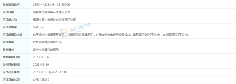 总投资528万元,位于流沙东街道玉环社区,打造智能家具展示厅,并配套家电维修等设备设施。建筑面积1000平方米,占地面积500平方米。建设单位为广东领富商贸有限公司,项目起止年限2023-05-01至2023-12-01