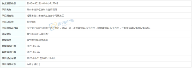 总投资508万元,位于普宁流沙东街道中河开发区,建设厂房,占地面积1332平方米,建筑面积1332平方米,并配套机器设备等设备设施。建设单位为普宁市流沙亿康制衣厂,项目起止年限2023-05-01至2023-12-01