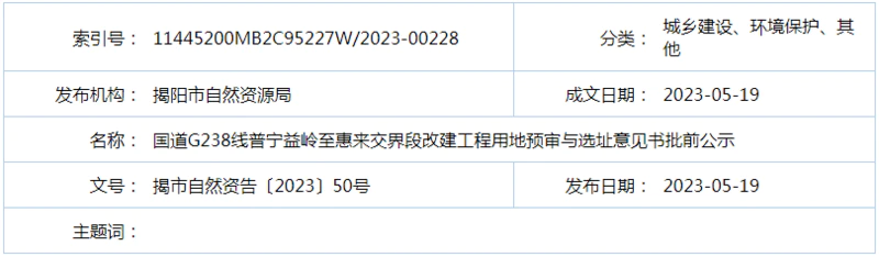 国道G238线普宁益岭至惠来交界段改建工程用地预审与选址意见书批前公示