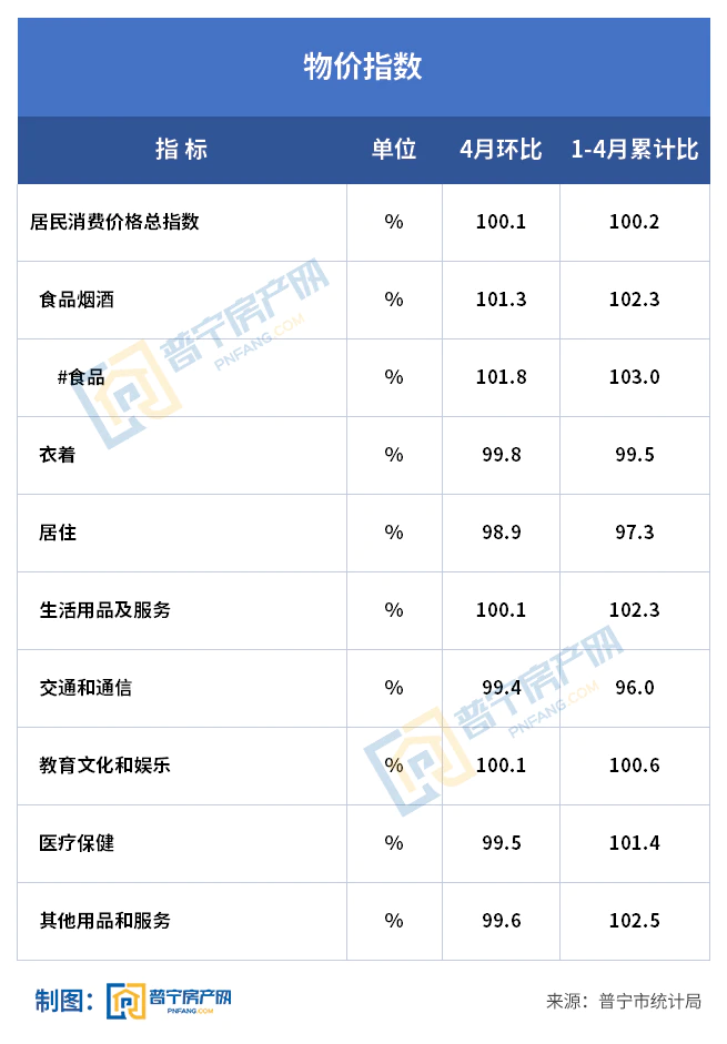1-4月,全市居民消费价格总指数(CPI)累计上涨0.2%,涨幅比一季度回落0.4个百分点。八大类商品(及服务)价格呈“5升3降”趋势。“5升”分别是:生活用品及服务类上涨2.3%,教育文化和娱乐类上涨0.6%,医疗保健类上涨1.4%、其他用品和服务类上涨2.5%,食品烟酒类上涨2.3%;“3降”分别是:衣着类下降0.5%,居住类下降2.7%,交通和通信类下降4.0%。