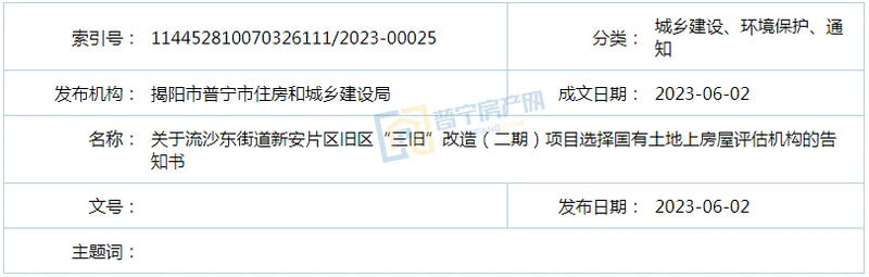 根据广东省人民政府《关于推进“三旧”改造项目促进节约集约用地的若干意见》(粤府[2009〕78号)《关于提升“三旧”改造水平促进节约集约用地的通知》(粤府办[2019]96号)、揭阳市人民政府办公室《关于深入推进“三旧”改造工作促进节约集约用地的实施意见》(揭府办[2018〕90号)等有关文件精神,以及“三旧”改造规划和年度实施计划,市政府拟对位于流沙东街道新安片区旧区(二期)项目用地进行改造,需要对以下范围内国有土地上的房屋实施征收拆迁改造。根据《国有土地上房屋征收评估办法》、《关于实施<国有土地上房屋征收与补偿条例>有关具体问题的通知》的有关规定,普宁市住房和城乡建设局负责房屋地上附着物评估工作,现将有关事项公告如下: