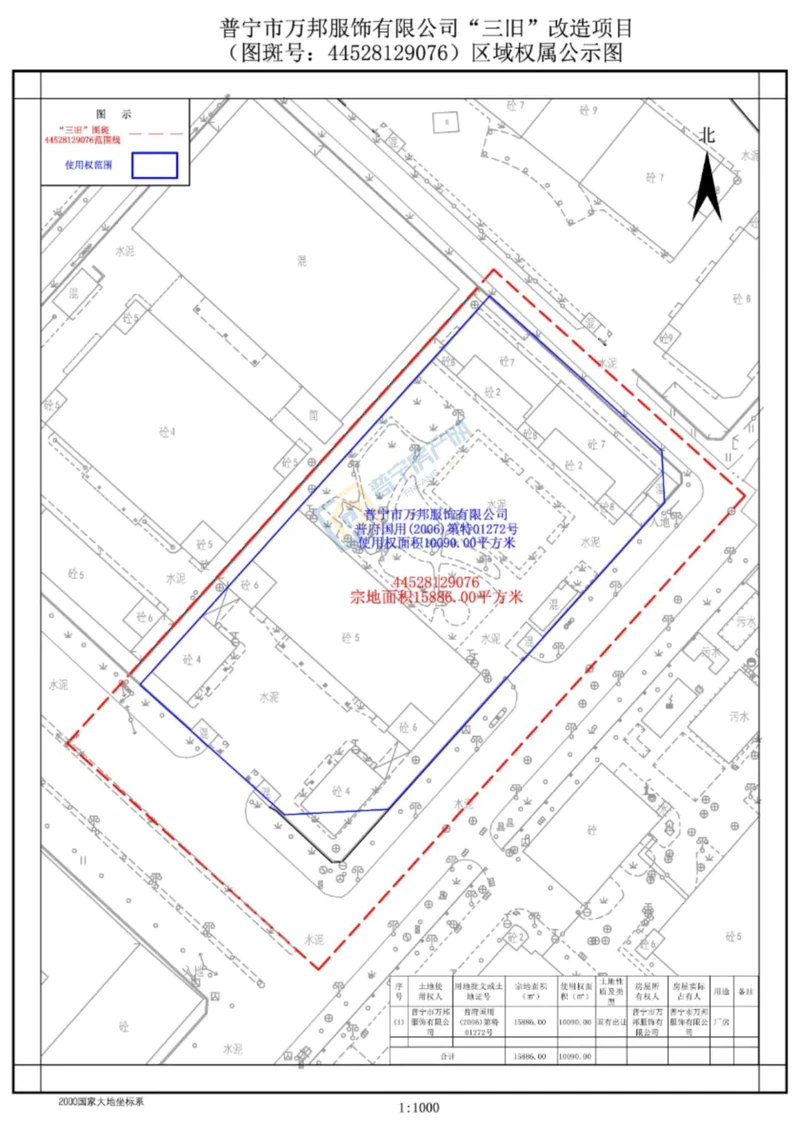 该改造片区总面积15886平方米(23.829亩),具体情况详见《普宁市万邦服饰有限公司“三旧”改造项目(图斑号44528129076)区域权属公示图》。