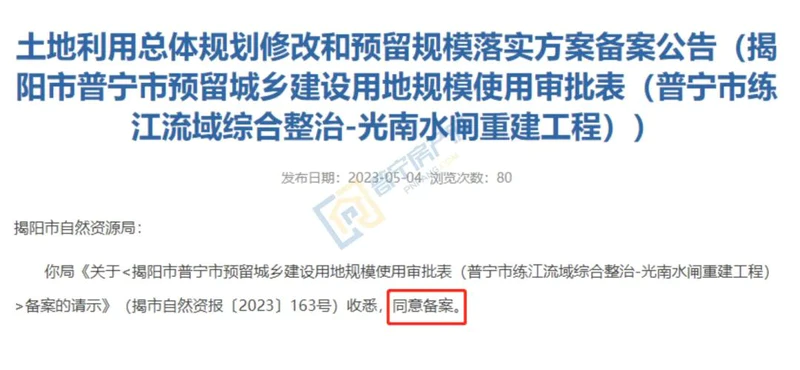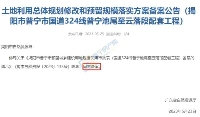 近日,据小房君了解, 普宁市一批预留城乡建设用地规模使用审批表获广东省自然资源厅同意备案,涉及国道324线普宁池尾(楼盘详情户型图相册地图)至云落段配套工程、普宁市练江流域综合整治-光南水闸重建工程、普宁市水质净化厂工程,合计5.4426公顷(81.639亩),具体内容如下: