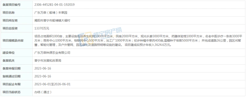 总投资13370万元,位于普宁市船埔镇大福村,项目占地面积1000亩,主要设施包括养生和院10000平方米、民宿2000平方米、观光长廊3000平方米、药膳体验馆1000平方米,名老中医诊疗一条街3000平方米;商务中心1000平方米、物联网中心500平方米,加工厂1000平方米;初步种植中草药400亩,温棚种子培育5000平方米;并完成道路26公里,园区AI智慧,智能化管理,及户外管网、园区绿化及道路照明等设施的建设。项目建成后预计年收入3624.6万元。建设单位为广东万森种源农业有限公司,项目起止年限2023-06-01至2026-06-01