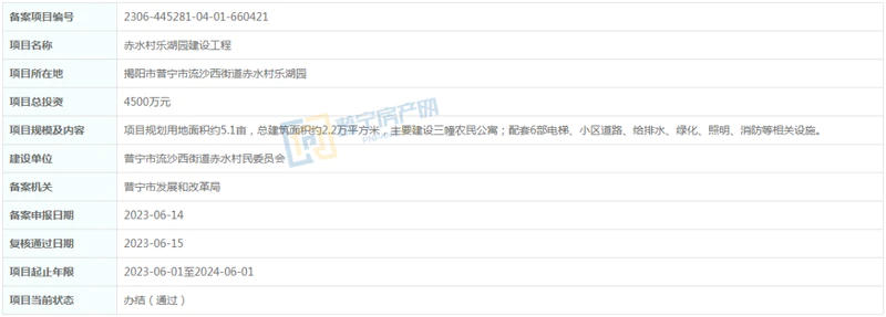 总投资4500万元,位于普宁市流沙西街道赤水村乐湖园,项目规划用地面积约5.1亩,总建筑面积约2.2万平方米,主要建设三幢农民公寓;配套6部电梯、小区道路、给排水、绿化、照明、消防等相关设施。建设单位为普宁市流沙西街道赤水村民委员会,项目起止年限2023-06-01至2024-06-01